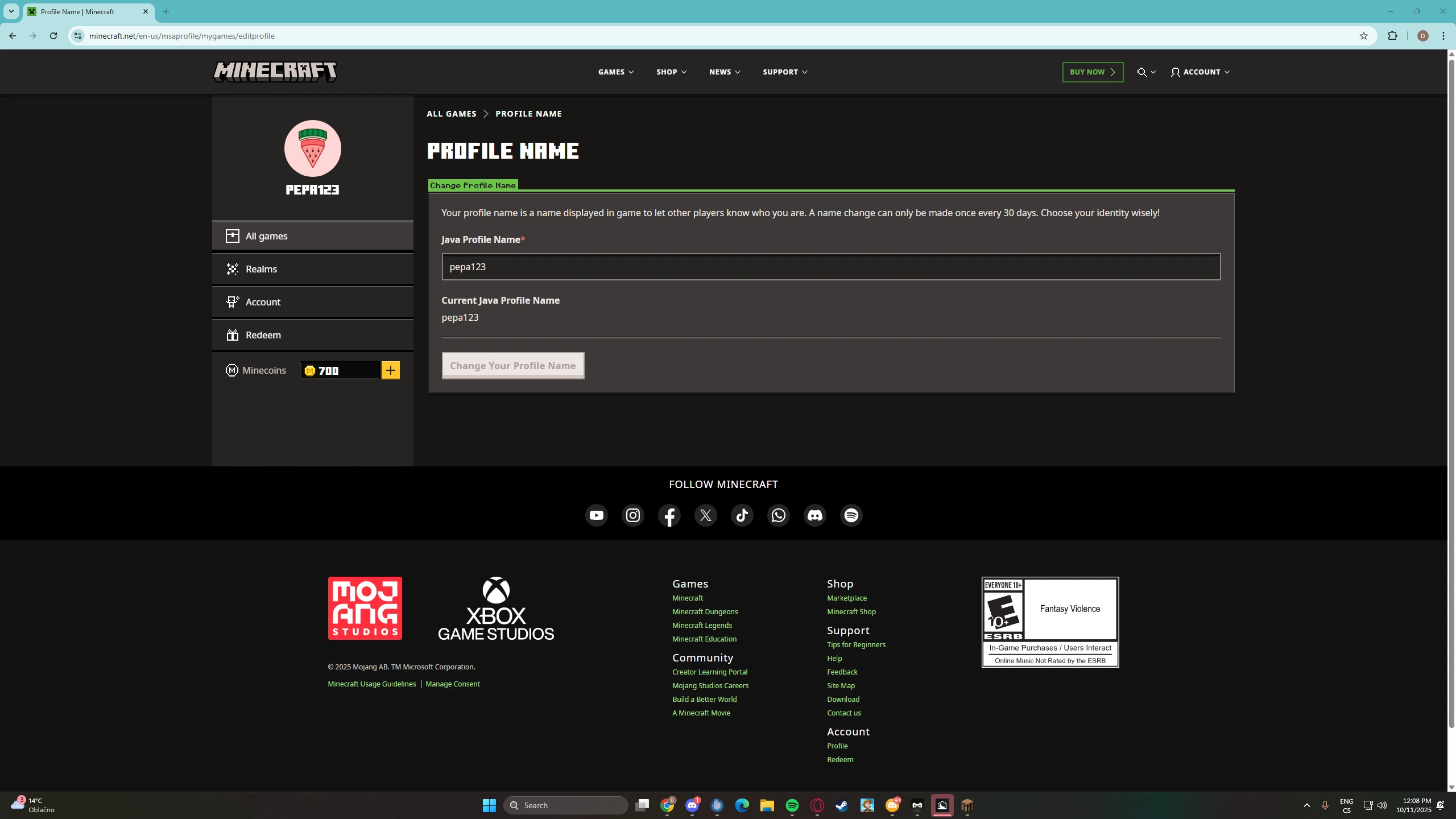 - 4.Jděte na web https://www.minecraft.net/en-us/msaprofile/ a přihlaste se. Ve sloupci Minecraft: Java Edition klikněte na Change Profile Name a pořiďte snímek.